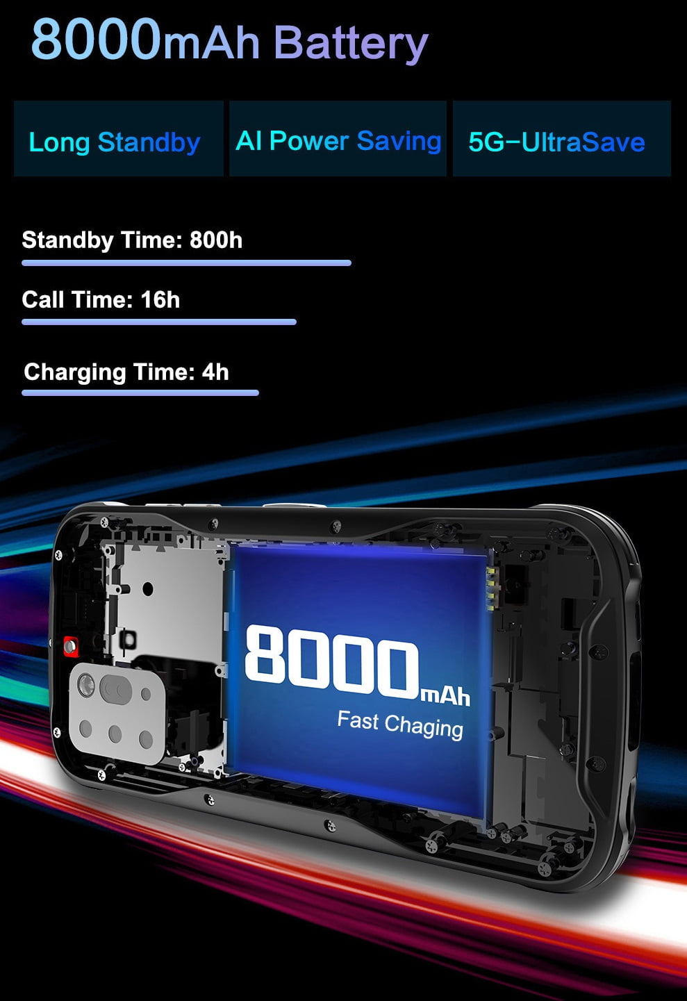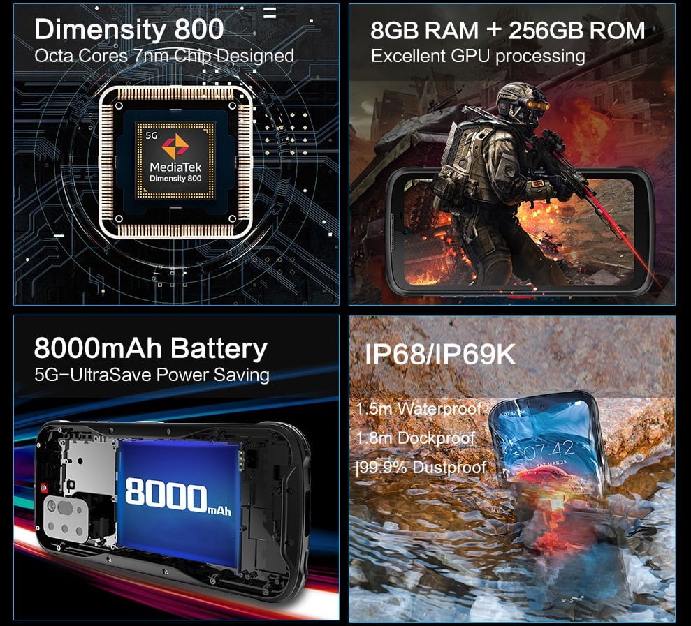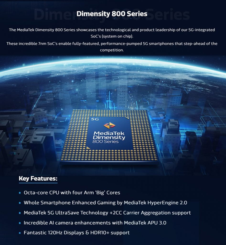 Dimensity 800 – 4x ARM Cortex-A76 (2 GHz), 4x ARM Cortex-A55 (2 GHz), ARM Mali-G75 MC5, APU 3.0, 5G Modem (2CC), MiraVision (4K HDR Video, 80MP Photo), Wi-Fi 5, Bluetooth 5.1, UFS 2.2, 16GB LPDDR4x Support
