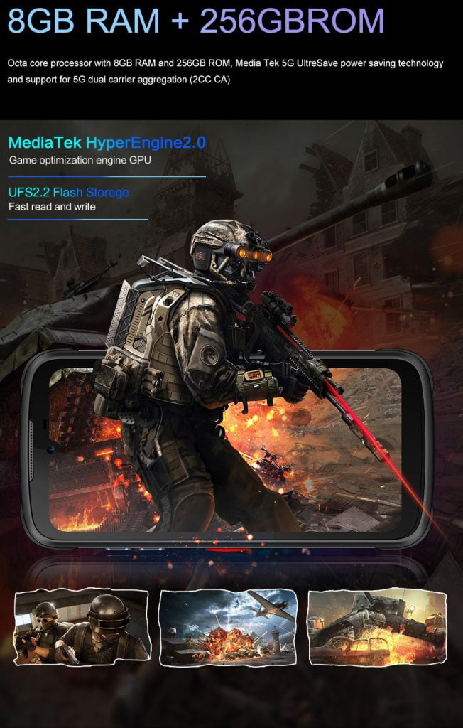 Dimensity 800 – 4x ARM Cortex-A76 (2 GHz), 4x ARM Cortex-A55 (2 GHz), ARM Mali-G75 MC5, APU 3.0, 5G Modem (2CC), MiraVision (4K HDR Video, 80MP Photo), Wi-Fi 5, Bluetooth 5.1, UFS 2.2, 16GB LPDDR4x Support
